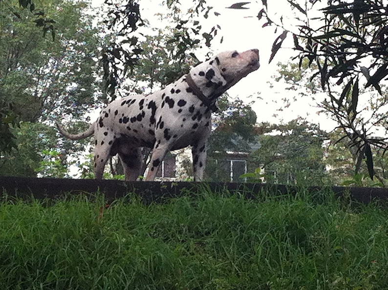 El dálmata de Irina apareció hace poco. ¿Por qué ahora? No lo sabemos. No lo esperábamos, Se paró a un lado del andador que se encuentra en la parte alta; miraba hacia abajo, hacia donde Irina se pegaba a su árbol, como buscándola. Ve el árbol con figura de mujer y parece dudar, o no acepta que ya no esté su dueña, la extraña. Luego desaparece. Lo hemos visto dos veces, hasta ahora, y solamente en la mañana. Tras unos minutos ahí, simplemente parado, observando el área, levanta la cabeza, el hocico y se pone a aullar, volteando hacia un lado y después hacia el otro. Conforme nos alejamos su aullido disminuye, pero se escucha lejos. Al regresar, de vuelta en nuestra caminata, ya no está.
