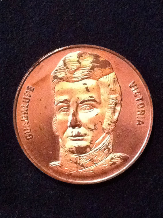 Al otro día, Armando estaba más extrañado que el anterior, me dijo que le había preguntado a su hijo por teléfono y que éste le había dicho que él no había ido a su casa en los últimosdías y que tampoco sabía de dónde procedía la moneda. La sacó entonces de su bolsilloy me la dio. Se trata de una moneda, más bien medalla sin argolla, conmemorativa de color cobre que mide 3.9 centímetros de diámetro por 3 milímetros de espesor; al frente tiene una cara grabada de Guadalupe Victoria en tres cuartos de perfil y las palabras “GUADALUPE” a la izquierda y “VICTORIA” a la derecha;atrás, un águila con las alas extendidas devorando una serpiente y parada sobre un escudo que dice en la primera línea: GUADALUPE VICTORIA; en la segunda: PRESIDENTE DE MEXICO; y en la tercera: 1824-1829.