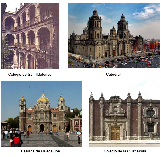 Como ejemplos de arquitectura de la época están, por supuesto, la Catedral, el Palacio Nacional, el Templo de Santo Domingo, el Colegio de San Ildefonso, la arcada del Acueducto de Salto del Agua (Chapultepec), y la Alameda central como muestra de la arquitectura de paisaje europea.