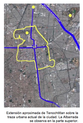 En la imagen podemos ver la superposición de edificios del recinto ceremonial de Tenochtitlan sobre la traza del Centro Histórico, de acuerdo a lo descubierto por el INAH en sus excavaciones hasta el momento.
