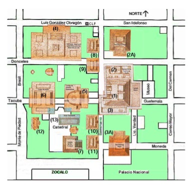 El número 1 es el Templo Mayor, el cual está actualmente abierto a las visitas del público.