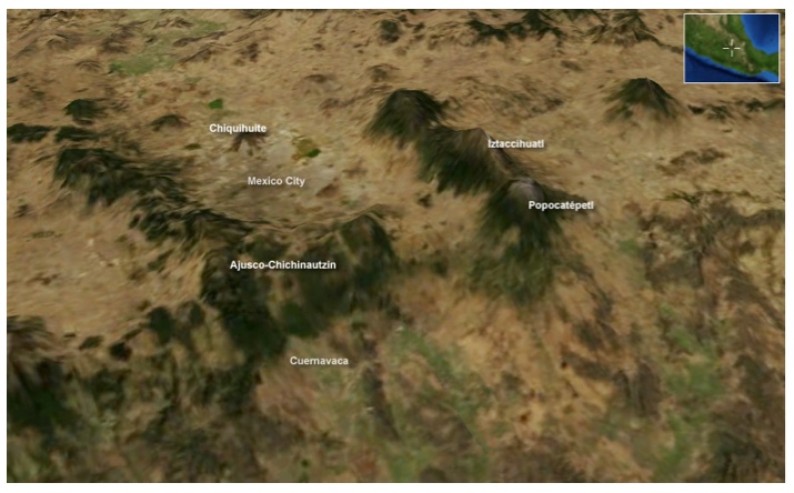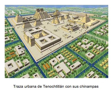 La imagen muestra la distribución esquemática de los islotes que encontraron los mexicas a su llegada. Se establecieron originalmente en Tenochtitlán, y trece años después, un grupo descontento con la repartición de las chinampas fundó la ciudad de Tlatelolco, que terminó siendo satélite de la primera y desarrolló el comercio como su actividad fundamental. Los mexicas, o aztecas, se sustentaban en la agricultura como base de desarrollo y utilizaron la religión y la guerra como medio de expansión. Cuando llegaron los españoles a interrumpir su próspero reinado controlaban un gran porcentaje de lo que ahora es México y parte de Guatemala. Levantaron la ciudad sobre el lago con asombrosas obras de ingeniería hidráulica con rellenos, pilotes y canales internos, así como diques contenedores de aguas y puentes.